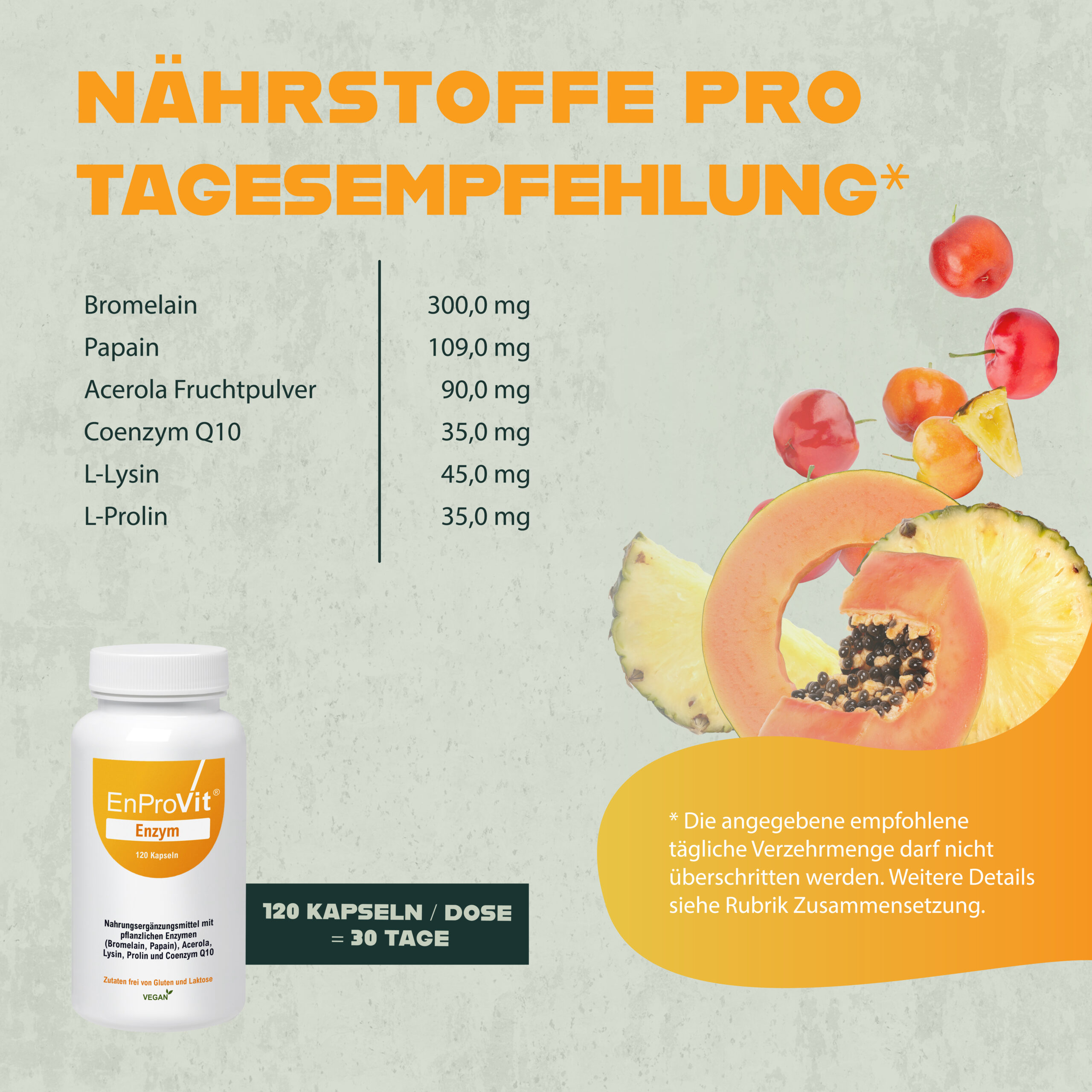 EnProVit Enzym darf nicht eingenommen werden, wenn Du allergisch auf Bromelain (Ananas), Papain (Papaya) oder einem anderen Inhaltsstoff reagierst.